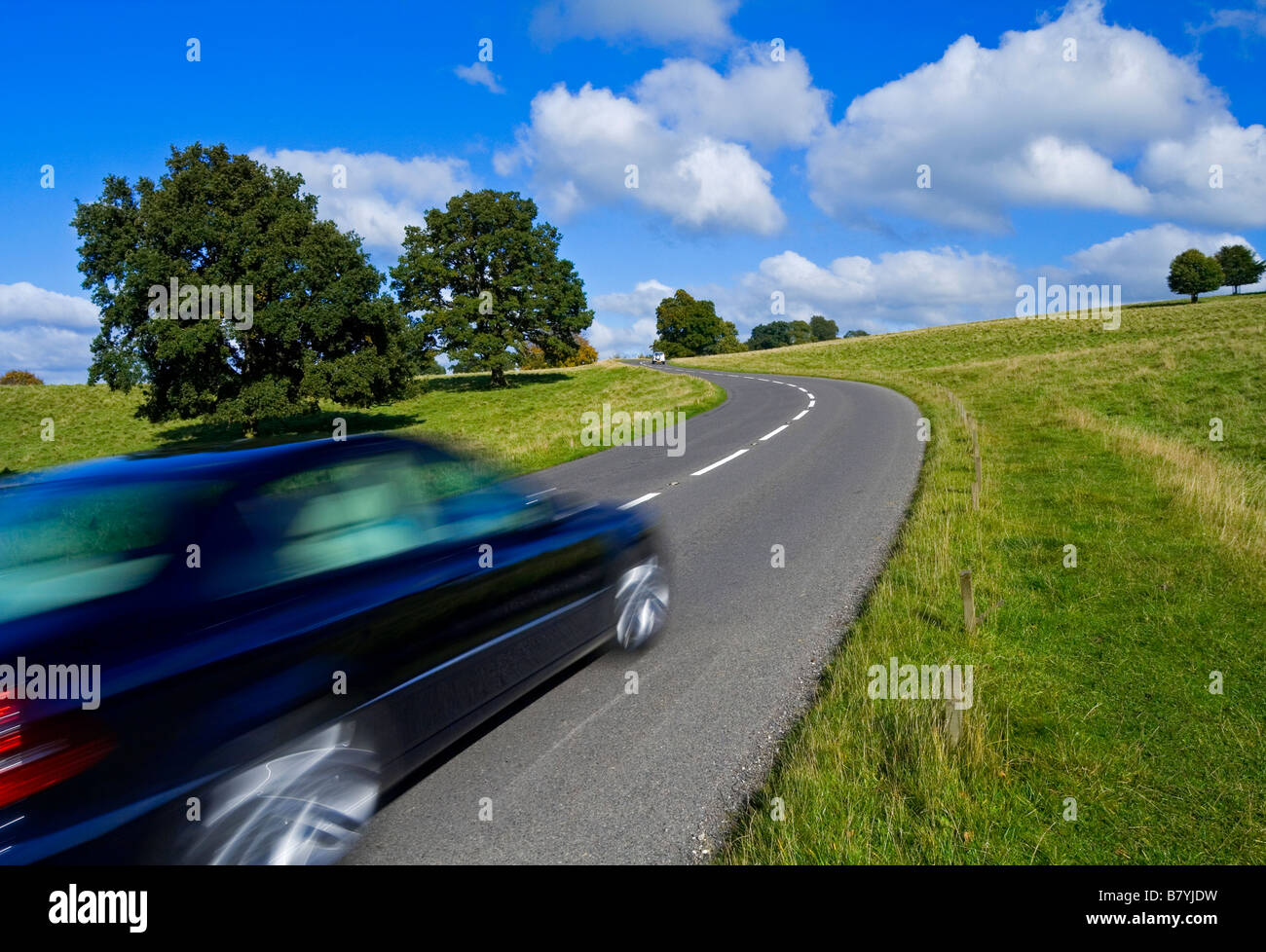 Car Driving Fast On A Winding Country Road With Trees And A Cloudy Stock Photo Alamy