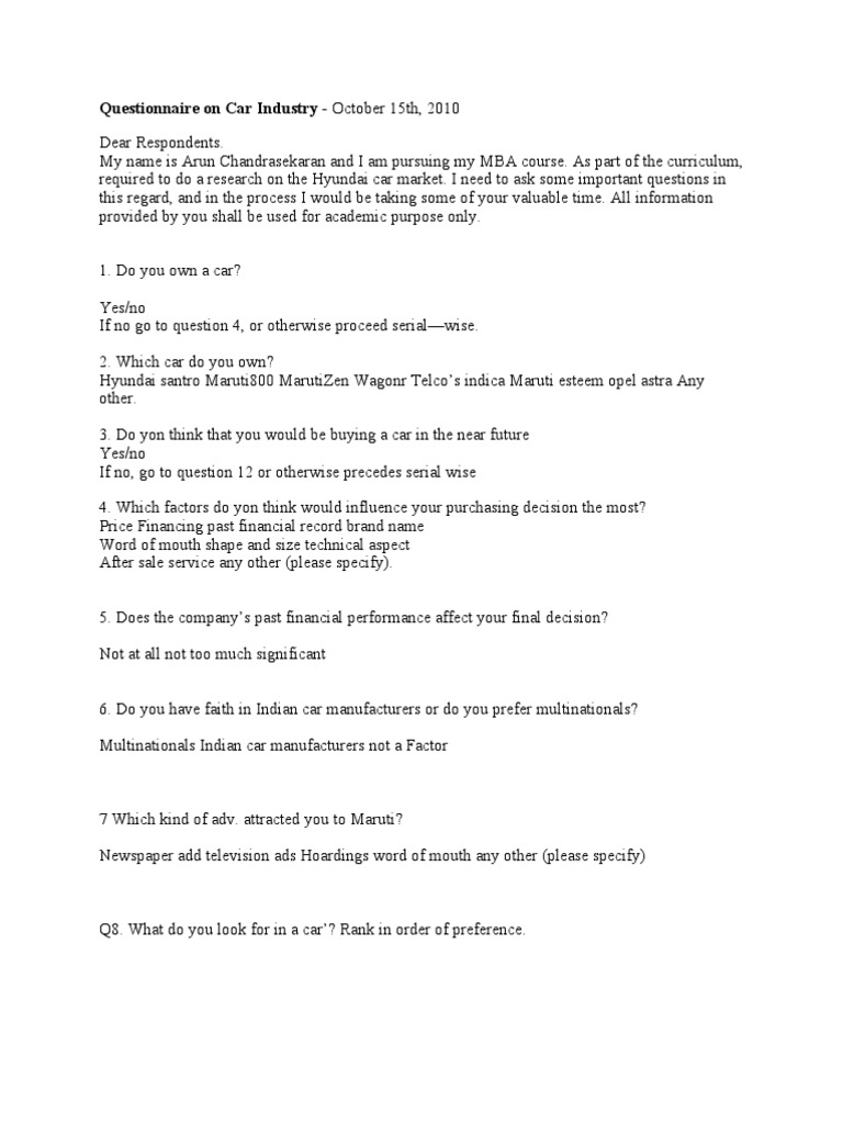Questionnaire On Car Industry Car Motor Vehicle